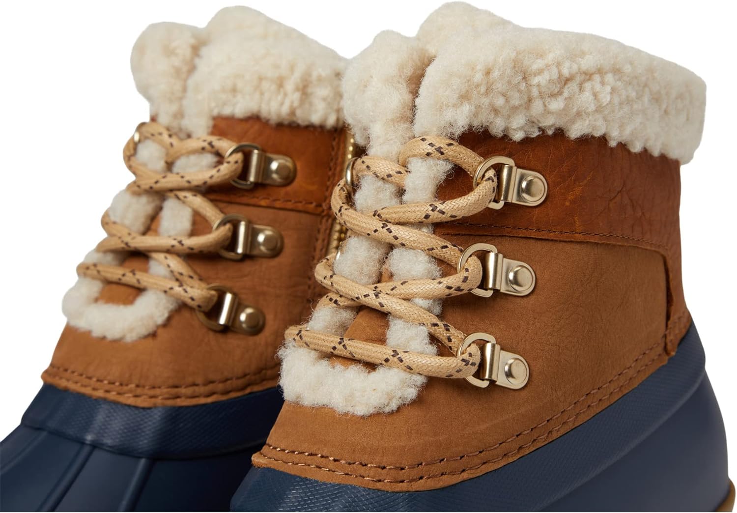 Water-resistant leather shaft with faux fur trim and rubber duck shell D-ring hardware with cotton laces and side zipper for easy on/easy off versatility and a secure fit